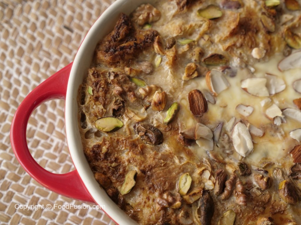 Baking dish mein puff pastry ko break ker ka dal dein,darchini powder,khopra,kishmish, hazelnuts, akhrot,pista,tayyar doodh dal dein aur upper sa cream aur badam dal dein.