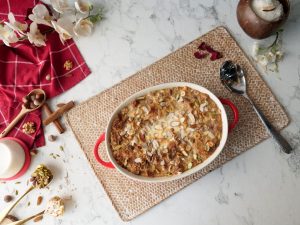 On baking dish,break puff pastry into pieces,sprinkle cinnamon powder,desiccated coconut,raisins, hazelnuts,walnuts,pistachios,prepared milk,topped with cream and sprinkle almonds.