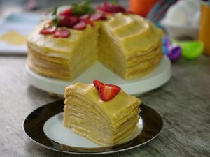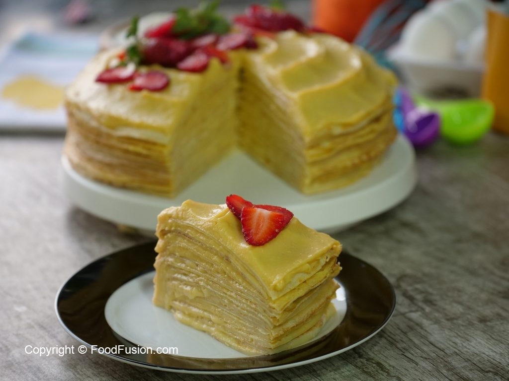 Remove from frying pan and place the crepe on a kitchen towel so that it will not stick & allow the layers to cool down completely at room temperature before stacking them (makes 15).
