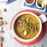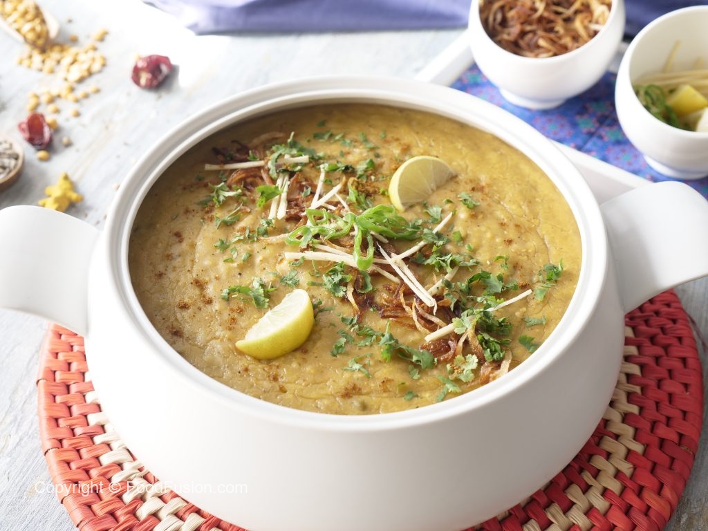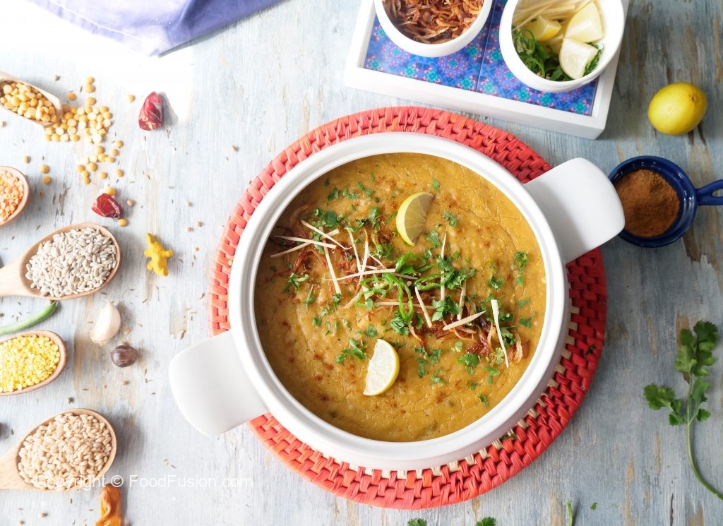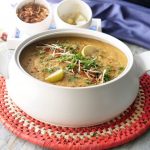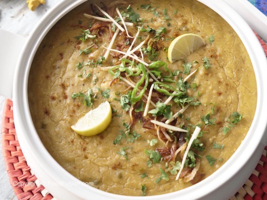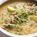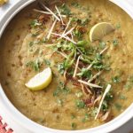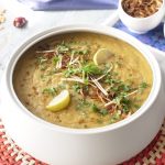 Dish out daleem & sprinkle fried onion, ginger, green chillies, fresh coriander, chaat masala,add lemon wedges & serve.