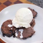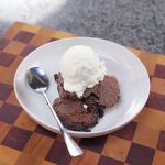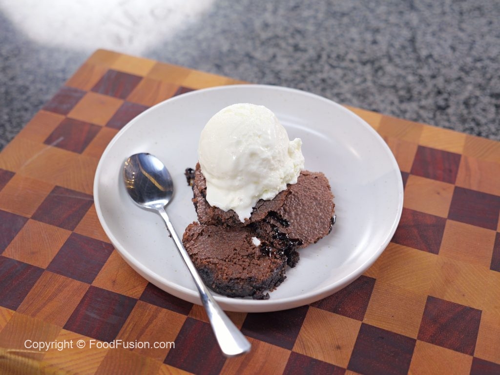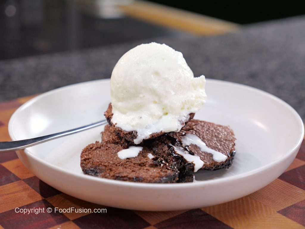 -Take it out of the oven & let it cool for 15 -20 minutes, scoop out the brownie pudding & add it to a serving plate, serve with ice-cream.