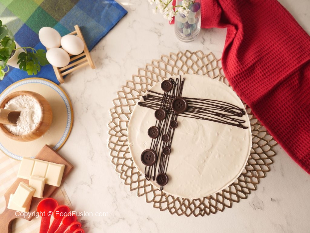 Cheesecake ko melted dark chocolate aur chocolate button sa decorate ker len desired slices mein cut ker ka serve karein!